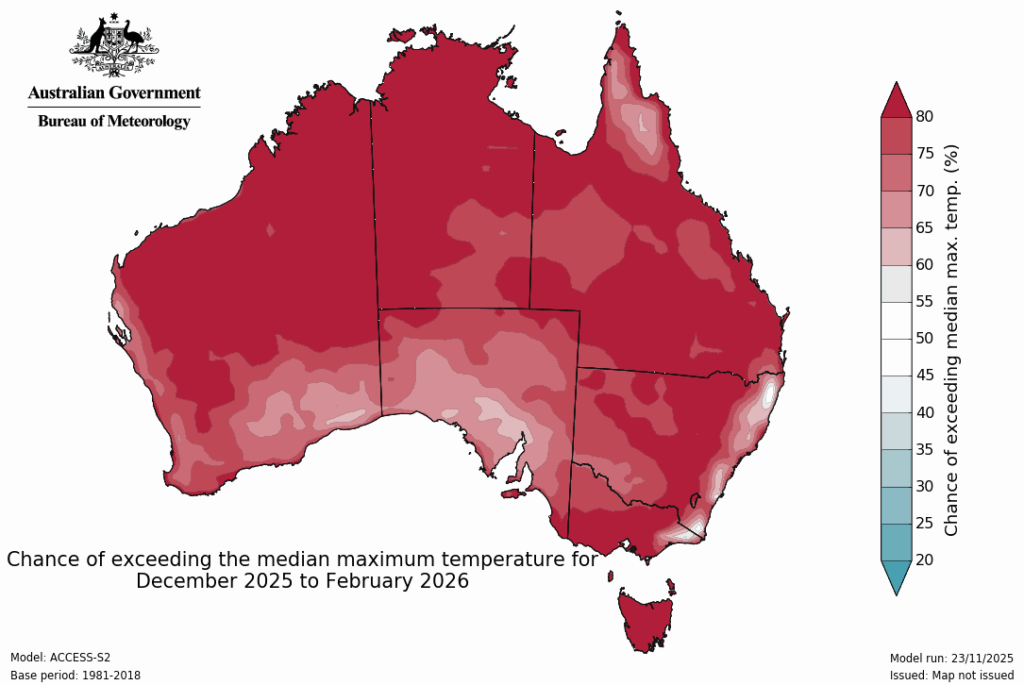Image: Chance of exceeding the median maximum temperature this summer. Source: Bureau of Meteorology.