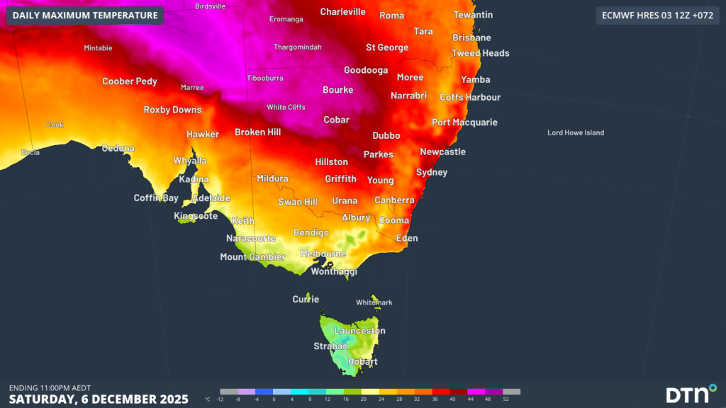 Image: Forecast maximum temperatures on Saturday, December 6, 2025.