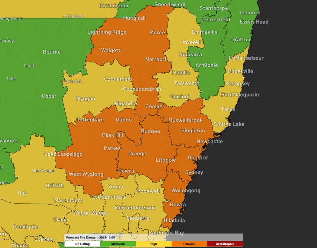 Extreme fire danger ratings are likely to develop in parts of southern NSW on Friday and central, eastern and northern NSW on Saturday. Saturday’s Extreme fire danger is likely to affect parts of the Greater Sydney, Greater Hunter and Illawarra/Shoalhaven districts.