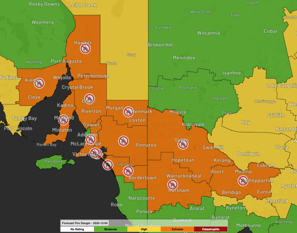 The combination of heat, blustery winds and low relative humidity have caused Extreme fire danger ratings over central and eastern part of SA on Thursday. Total fire bans have been declared in eight of the state’s 15 districts:
