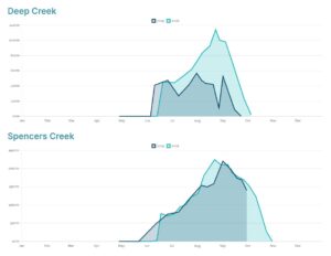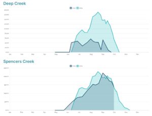 The 2004 graphs (below) paint the picture even more starkly. Again, the peak depth and season duration at Spencers Creek was similar in 2004 to 2025. But this year’s peak depth at the lower Deep Creek site was only about a third of the 2004 peak depth.