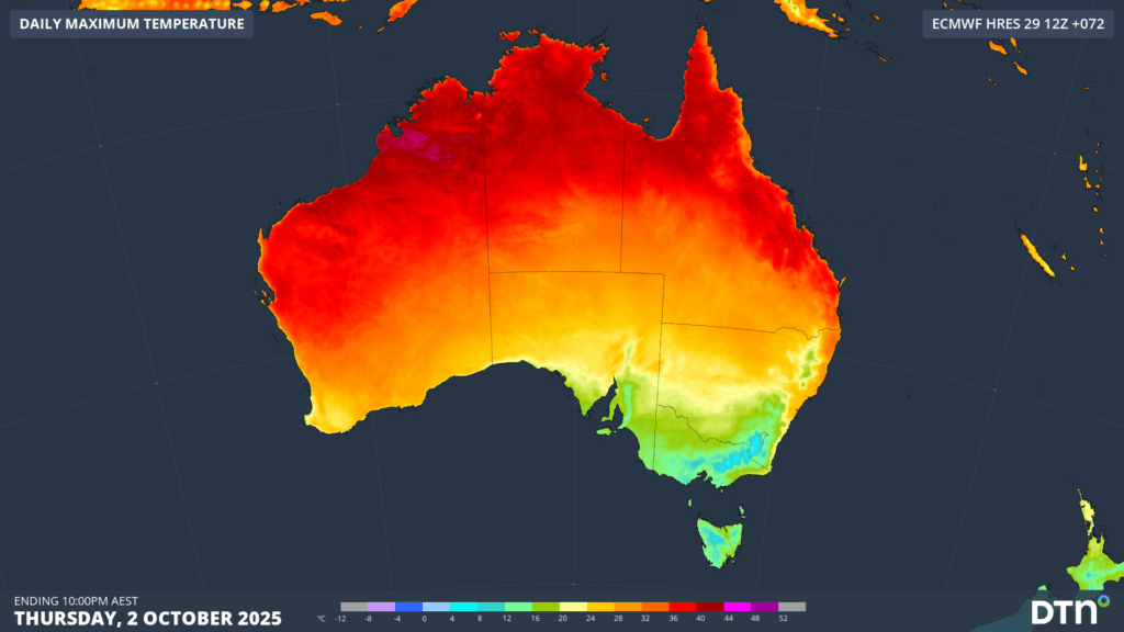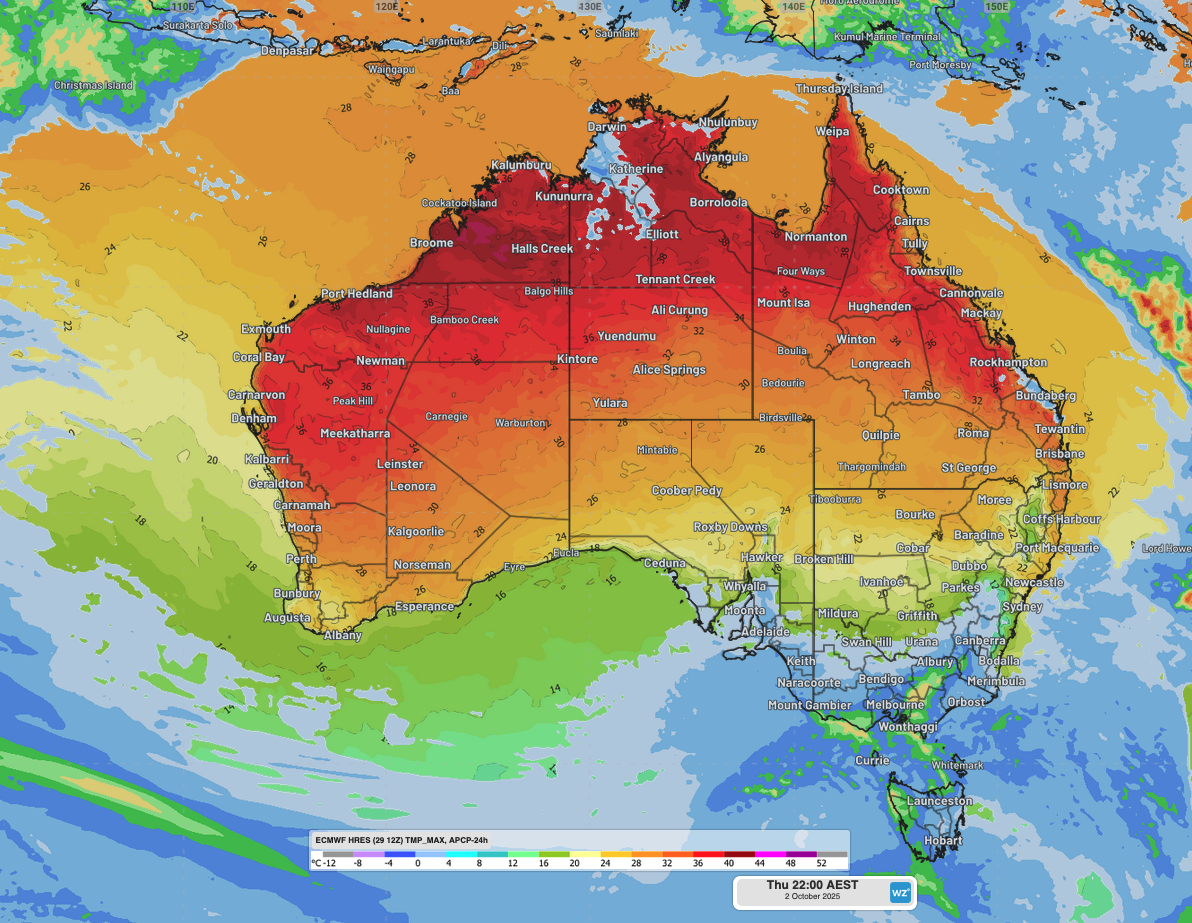 Image: Forecast maximum temperature on Thursday, October 2, 2025, showing warm air over northern and eastern Australia and cooler temperatures over the country’s south.