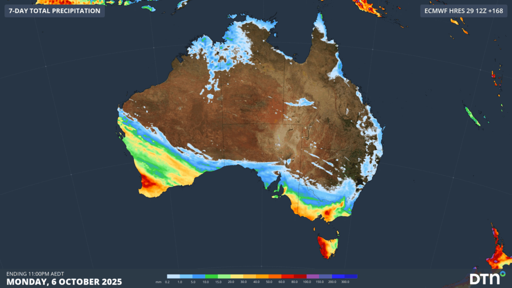 Image: Forecast accumulated rain this week, showing most of the rain falling over southern and southwestern Australia and indicating less wet weather in the north and east.