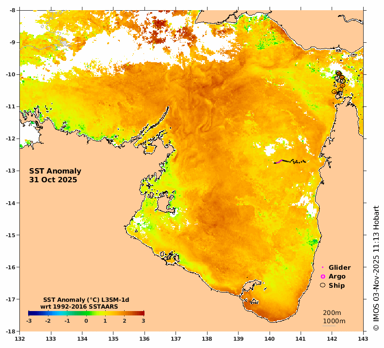 Image: Sea surface temperature anomalies in the Gulf of Carpentaria on October 31, showing warmer-than-normal water for the start of the tropical cyclone season. Source: IMOS