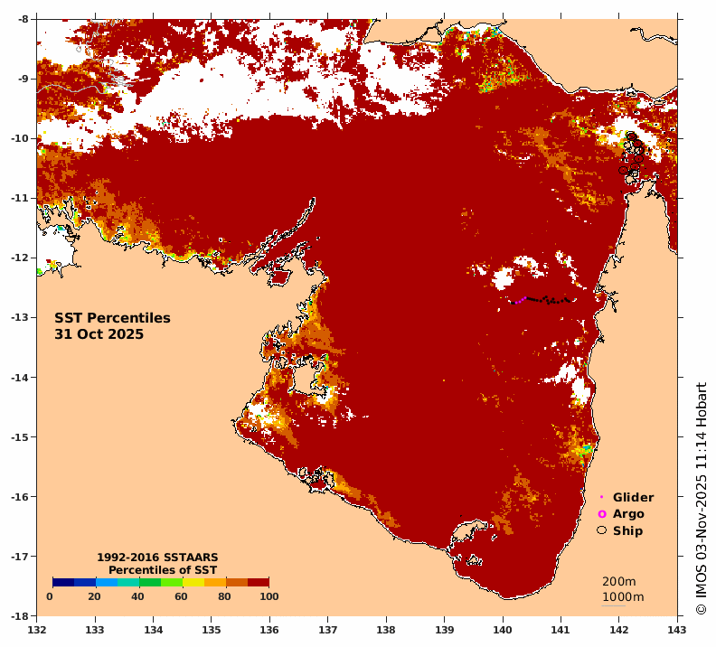 Image: Sea surface temperature centiles in the Gulf of Carpentaria on October 31. The red areas show where temperature area in the highest 10 percent of historical records. Source: IMOS