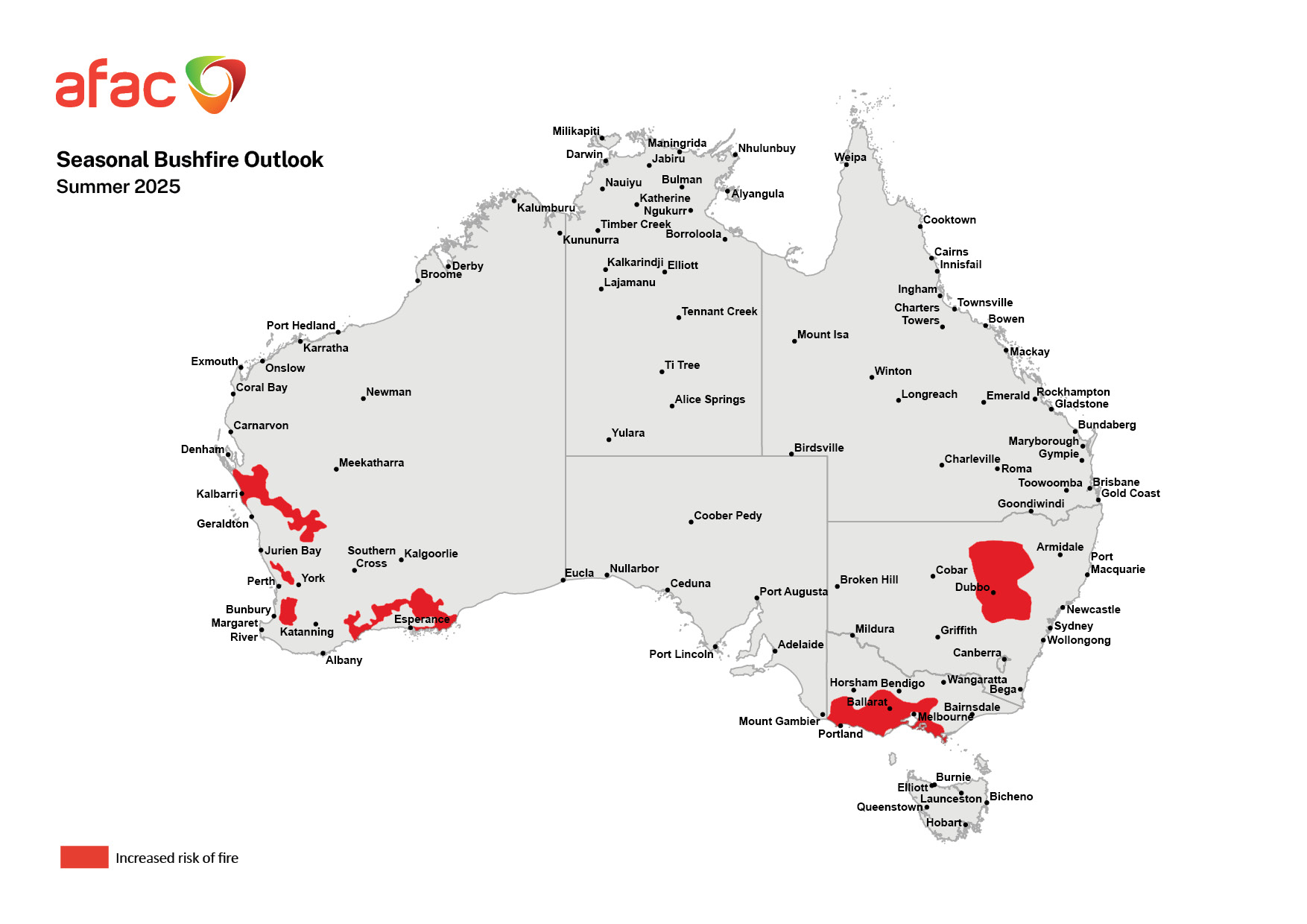 Image: The AFAC Seasonal Bushfire Outlook for the 2025-26 summer highlighting key regions of increased risk of fire in the coming months. Source: AFAC.