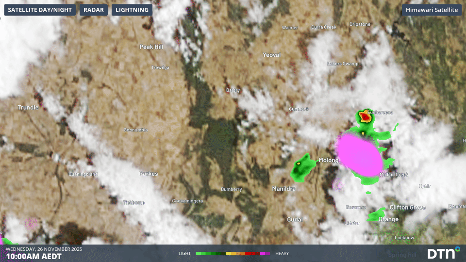 Image: A series of thunderstorms igniting a fire over central NSW, north of Parkes, on Wednesday, November 26, 2025.