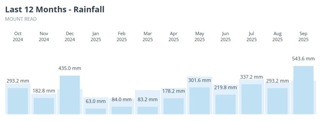 Mount Read’s run of eight below-average rainfall months to start the year was broken this September, with rain on every single day of the month except September 5, and a total of 543.6mm which was well over the 379mm monthly average.