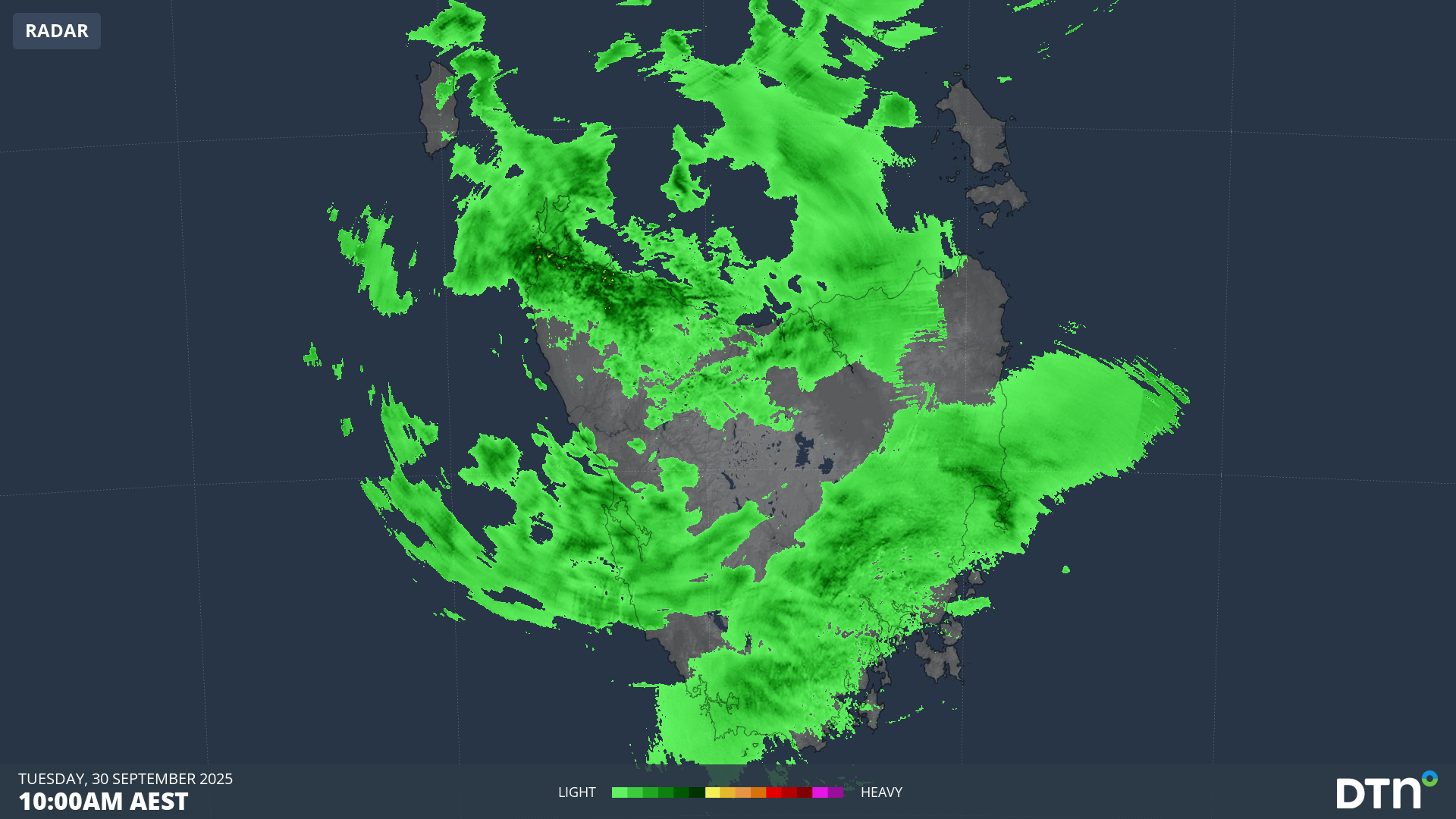 Video: Six-hour combined radar and satellite loop for Tasmania up until 3pm on Tuesday, September 30, 2025.