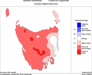 Image: Tasmanian rainfall deciles from January to August, 2025. Source: BoM.