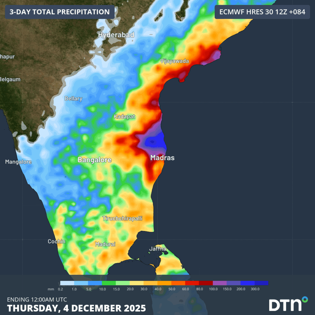 Image: Forecast rainfall accumulations in the three-day period to Thursday morning, December 4, 2025, showing heavy rainfall from the remnants of Ditwah impacting southern India.