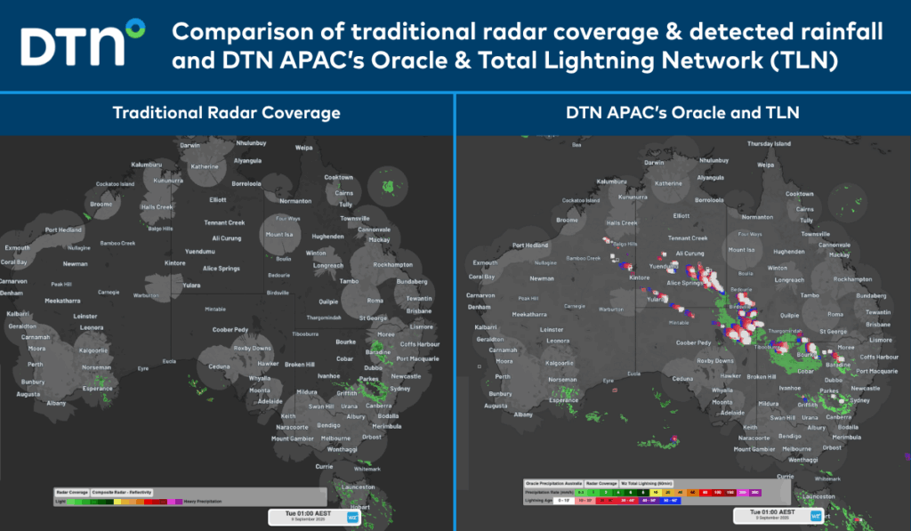 Image: Comparison of traditional radar coverage and detected rainfall (left), and DTN’s Oracle and TLN (right), across Australia at 1am AEST on Tuesday, September 9, 2025.