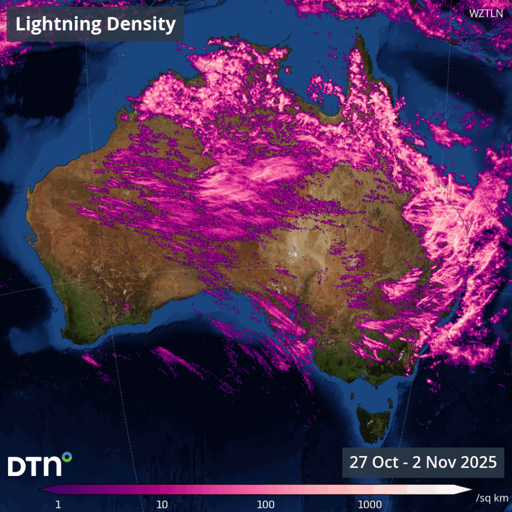 Image: Lightning detected over Australia by DTN’s TLN between Monday, October 27 and Sunday, November 2, 2025.