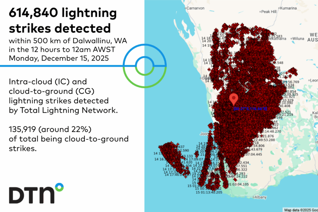 Image: DTN’s Total Lightning Network (TLN) detected a total of 614,840 lightning strikes within 500km of Dalwallinu between 12pm AWST Sunday, and 12am AWST Monday, December 15, 2025. Of the total lightning strike amount, 135,919 were recorded as ground strikes.