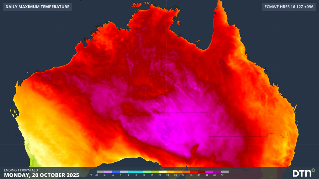 Image: Maximum temperature forecast for Monday, October 20, 2025, showing temperatures in the mid-40s across central parts of Australia.