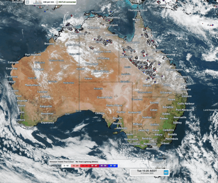 Image: Intense thunderstorm activity across Australia’s north and west on Tuesday and Wednesday, October 14 and 15, 2025, as seen on the DTN APAC Stormtracker Dashboard.