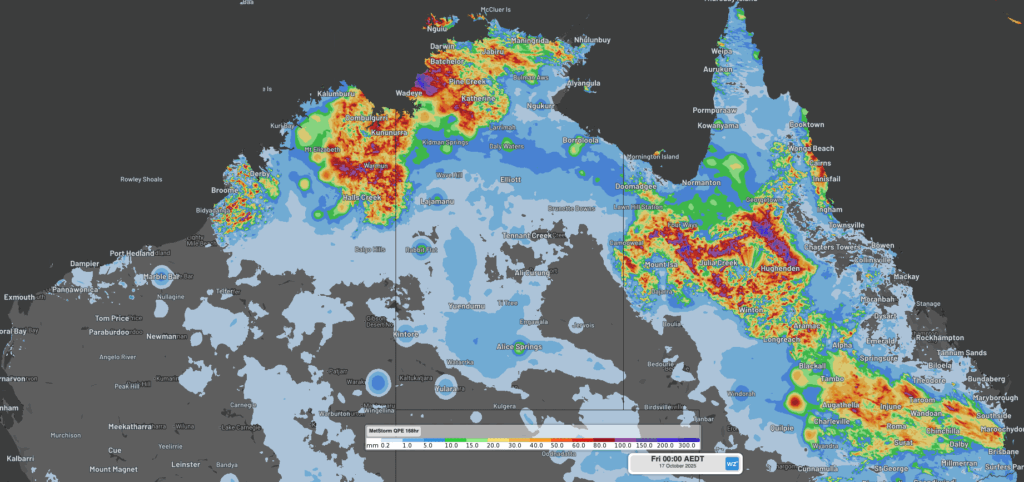 Image: DTN Quantitative Precipitation Estimates (QPE) of rainfall across northern Australia in the 7-days leading to Friday, October 17, 2025.