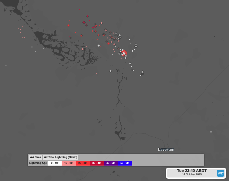 Image: Lightning strikes detected near a reported fire by WA fire services north of Laverton on Tuesday evening, October 14, 2025.