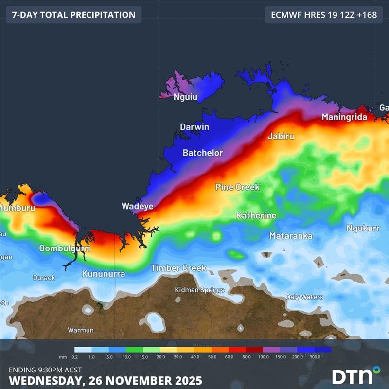 Image: Forecast accumulated rain over the next 7 days, according to the ECMWF model. The darkest blue shading indicates rainfall more than 300mm is expected. Source: DTN.