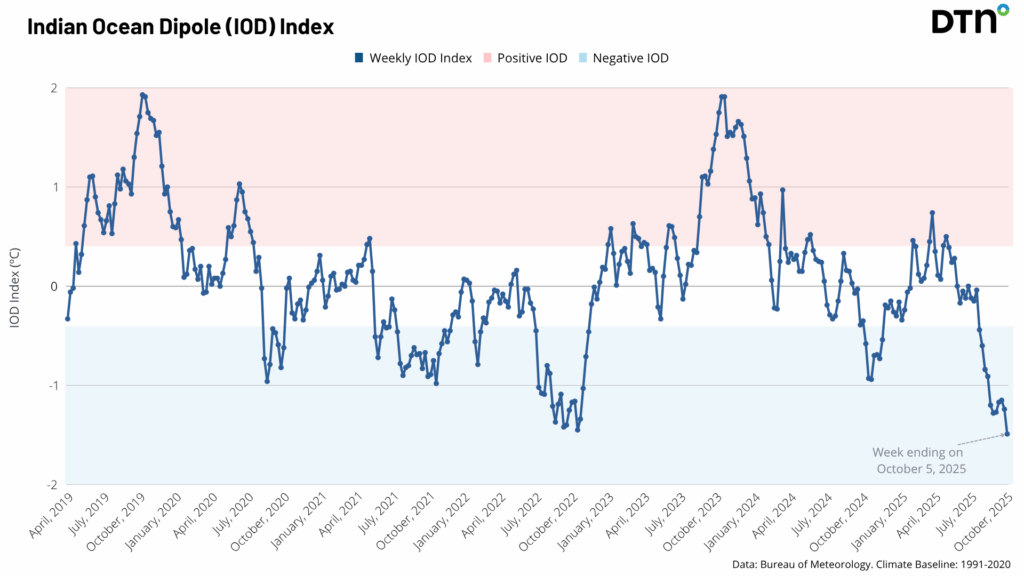 As the chart above shows, the IOD is currently in its strongest negative phase for several years, paving the way for the consistent occurrence of rain-bearing northwest cloudbands in coming months.