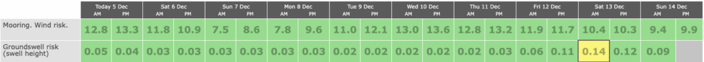 Image: DTN APAC Operational Forecast Summary showing the increasing groundswell risk on Friday, December 12, peaking on Saturday, December 13, in a simple, easy to understand, traffic light system.