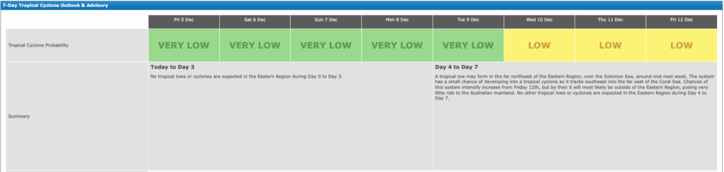 Fortunately for Australian industries and businesses, the latest outlook produced by DTN APAC Meteorologist only suggests a low chance of a tropical cyclone being within the Australian region in the next 7 days. This product is reviewed daily by experienced Australian meteorologists who assess the risk of tropical cyclones being active, and potential impacts to clients, within each region.