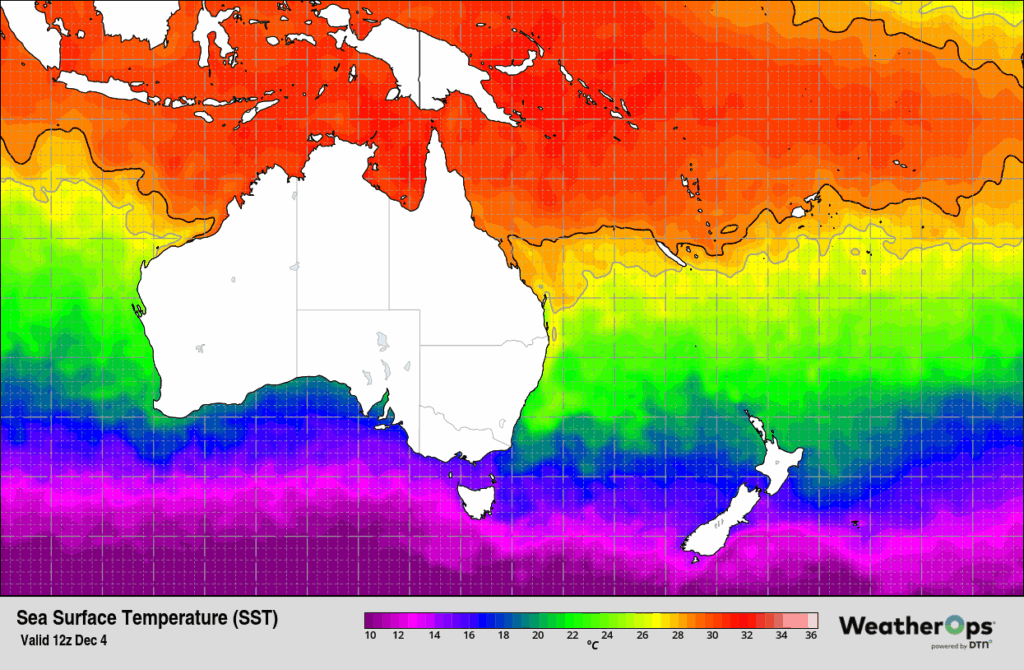 Image: Sea surface temperatures around Australia on Thursday, December 4, 2025.