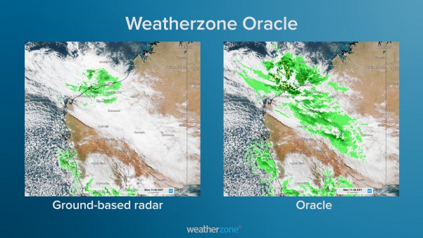 Today, much of the rainfall through inland parts of the Pilbara and the Kimberley region is falling out of ground-based radar range (figure 2). However, our synthetic radar system, Oracle, is picking up the extensive rainfall in the eastern Pilbara, Kimberley and Interior (figure 2).